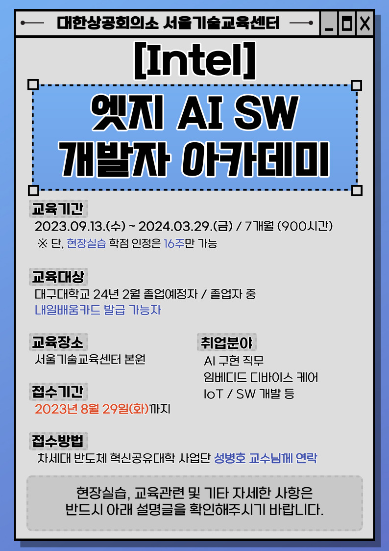 대한상공회의소 서울기술교육센터에서 진행하는 [Intel] 엣지 AI SW 아카데미 교육 신청을 안내드립니다.