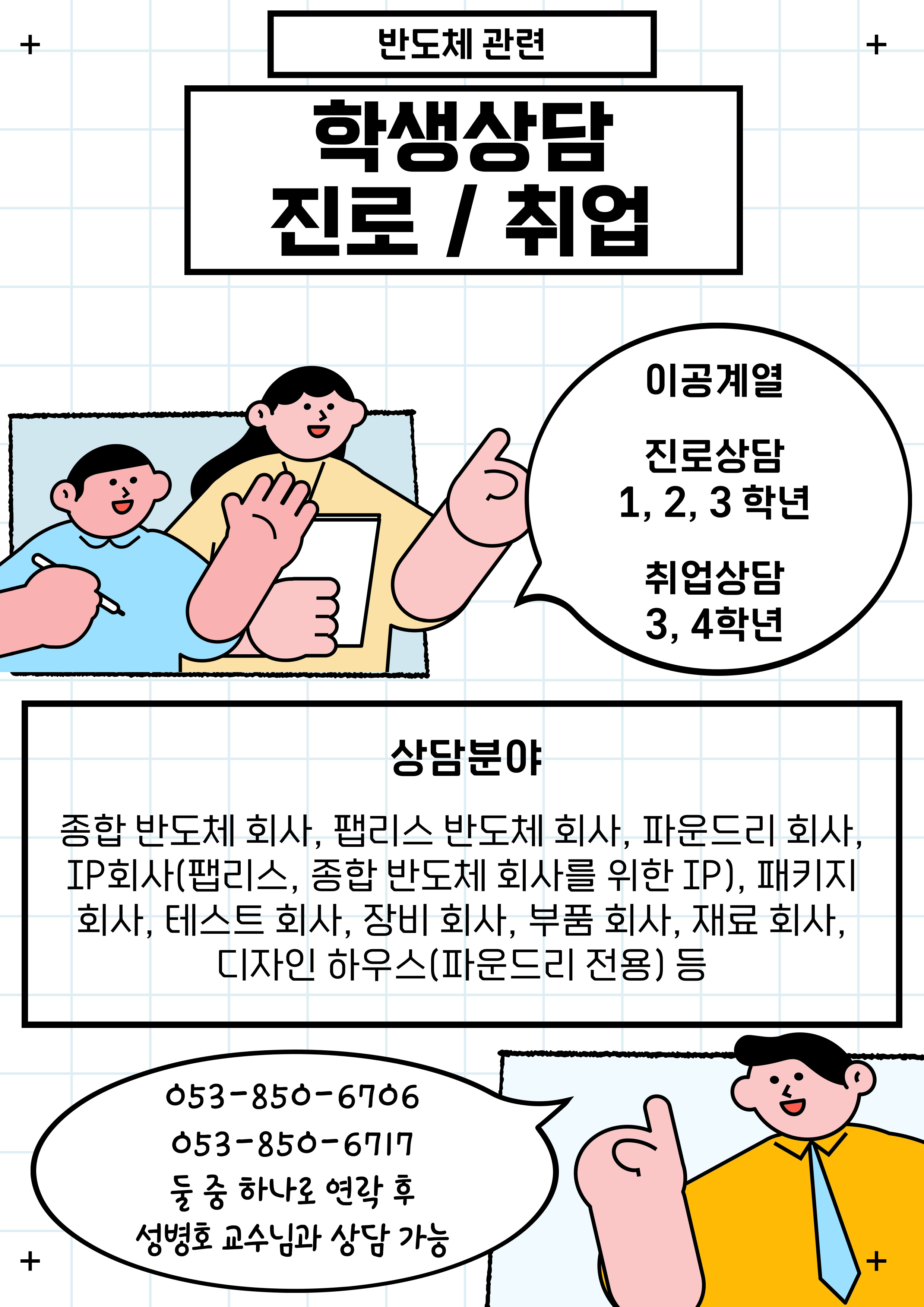 차세대 반도체 혁신융합대학에서 학생들을 위한 진로/취업 상담을 진행하오니 많은 참여 바랍니다.