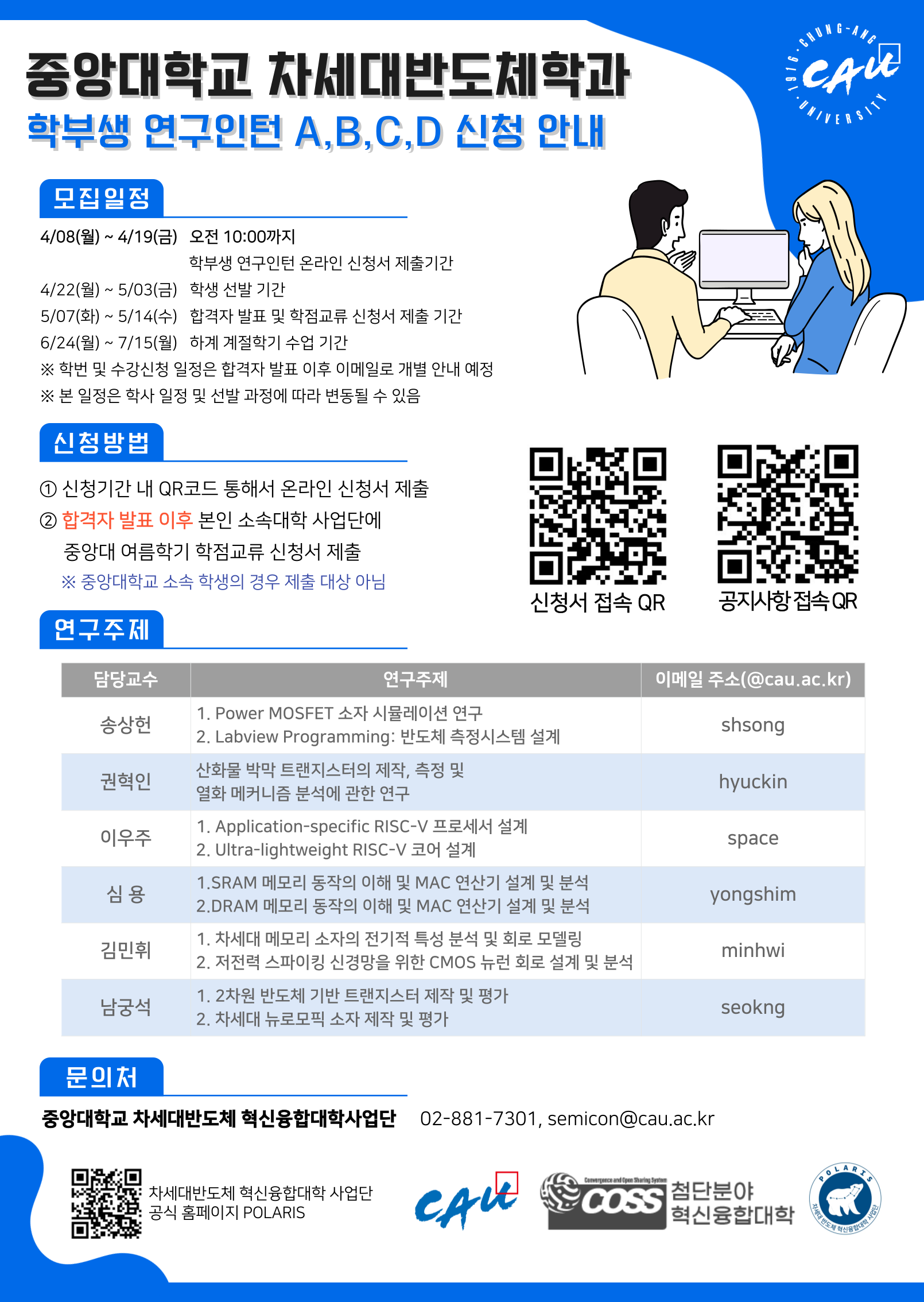 | 1 | 학부생연구인턴 A/D | 전선 | 1 | 연구 주제 확인 후 온라인 신청 | 대면 |