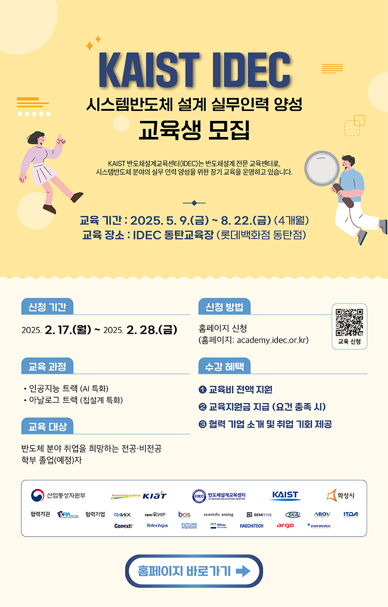 KAIST 반도체설계교육센터(IDEC)에서 제9기 시스템반도체설계실무인력양성 교육생을 모집합니다. 자세한 내용은 아래를 참고해주시기 바라며, 학생분들의 많은 관심과 참여를 부탁드립니다.